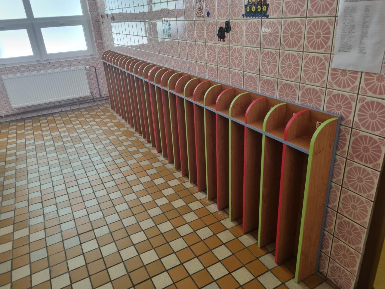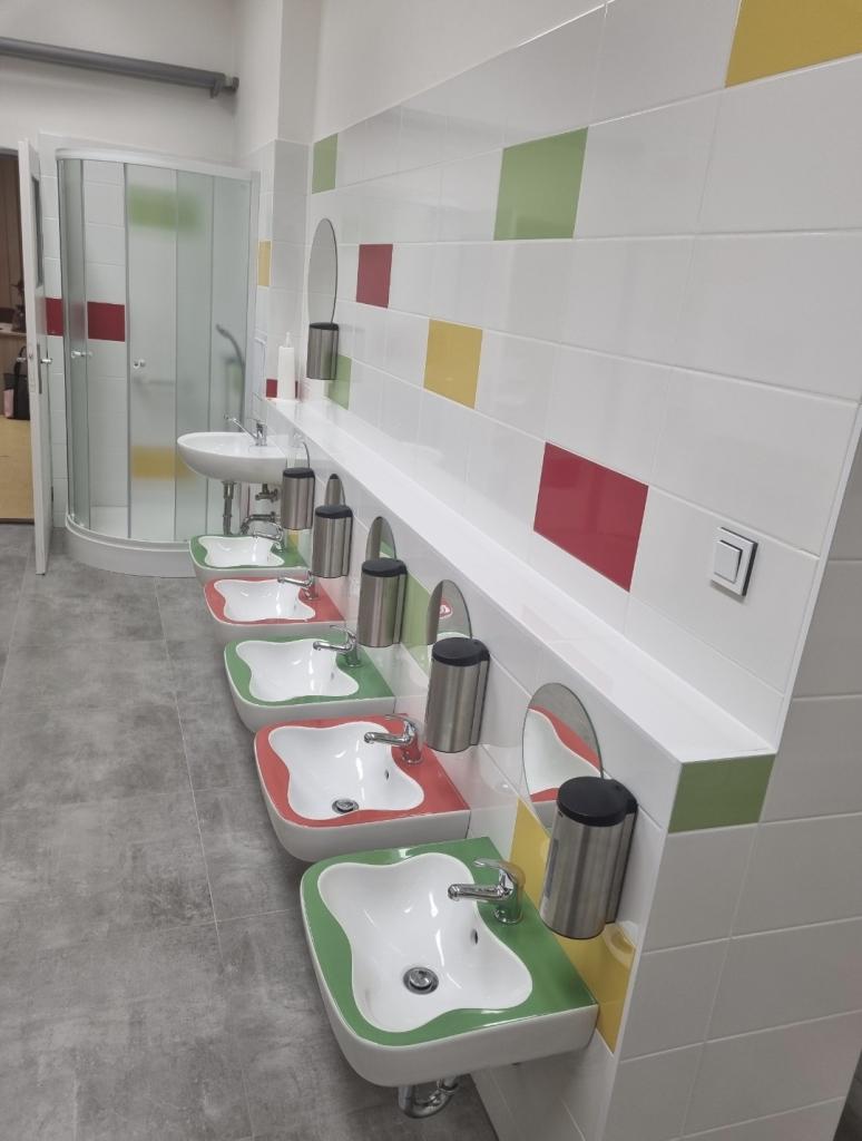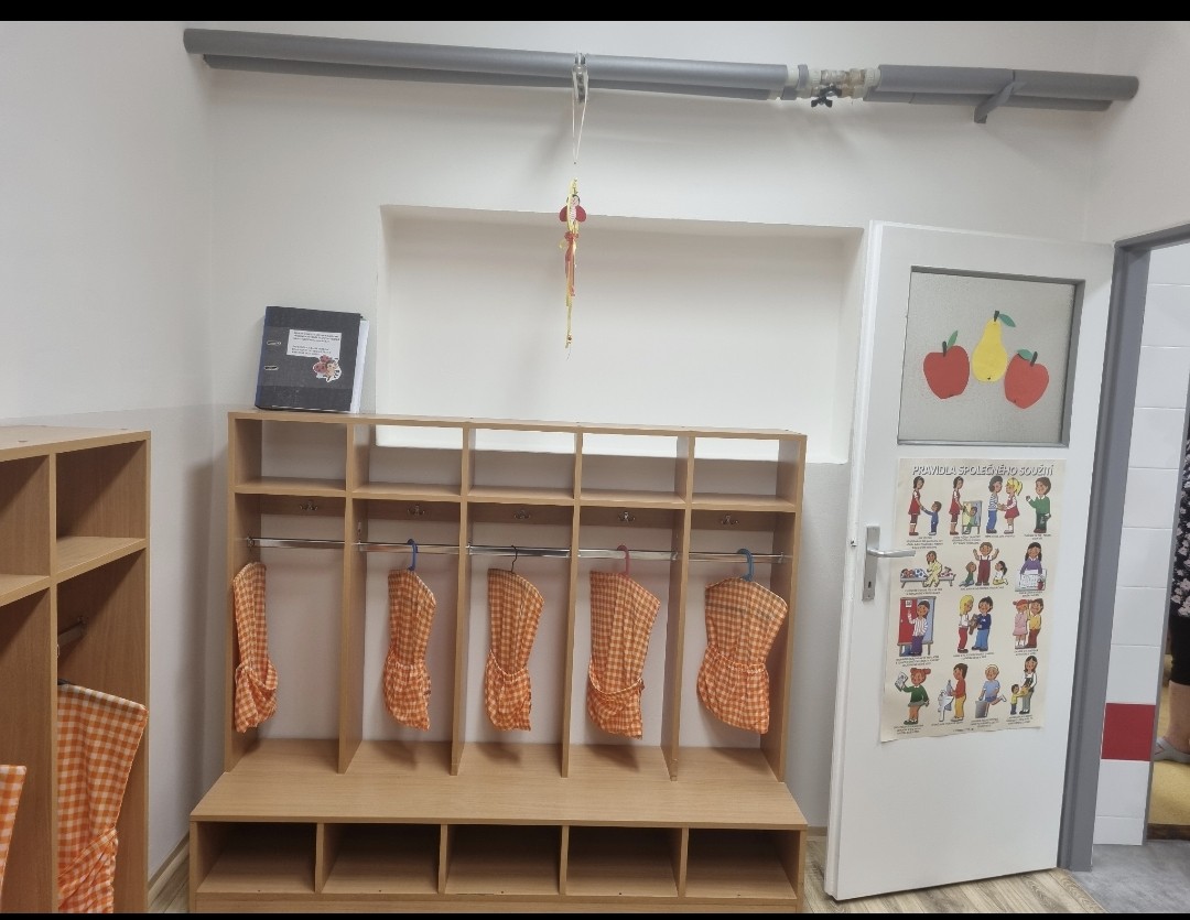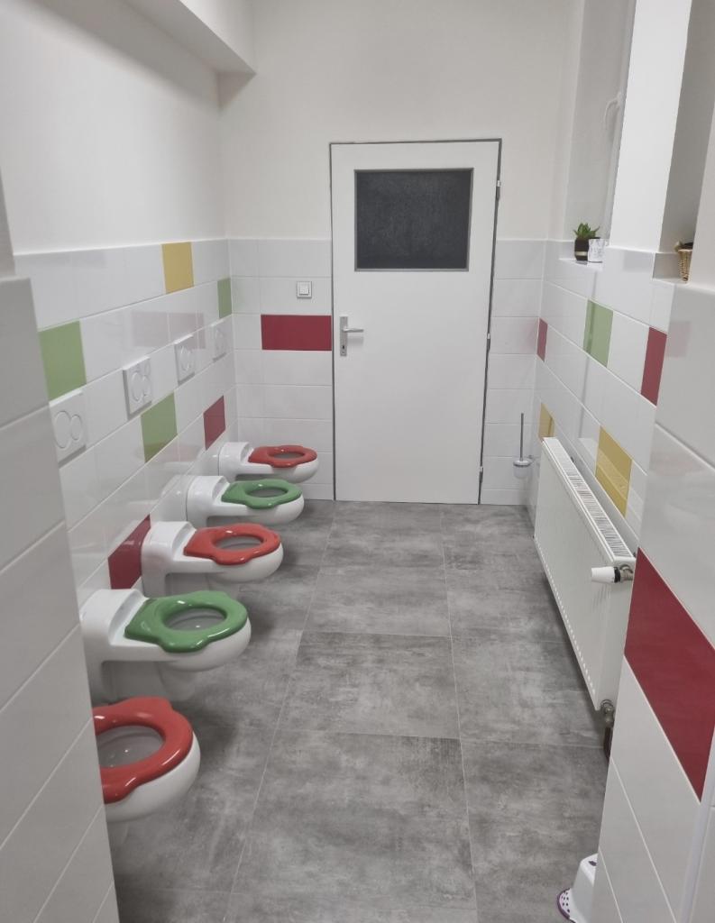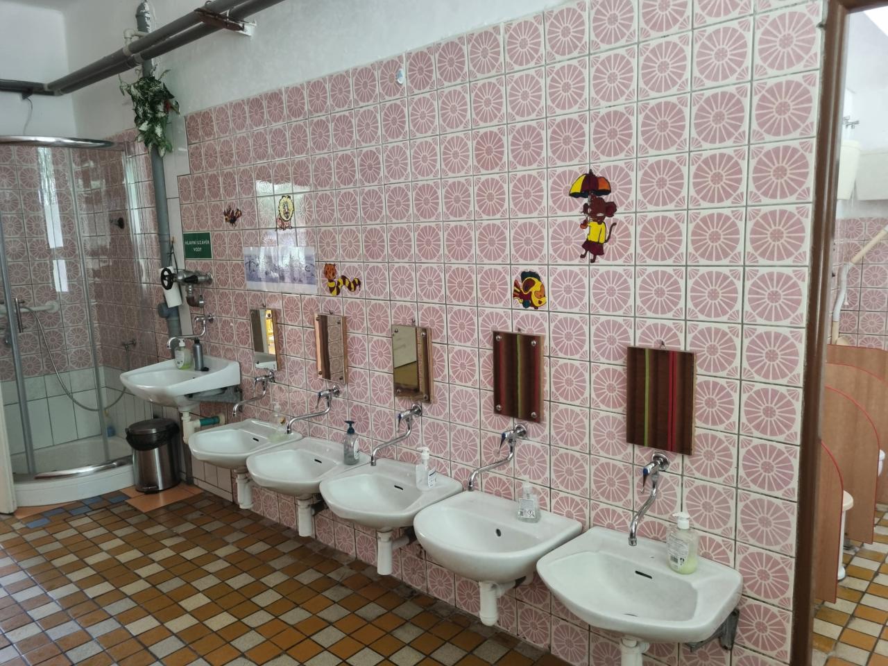 sociální zařízení, šatny dětí, zázemí učitelek, úklidová komora, sklad čistících prostředků a přípravná kuchyňka