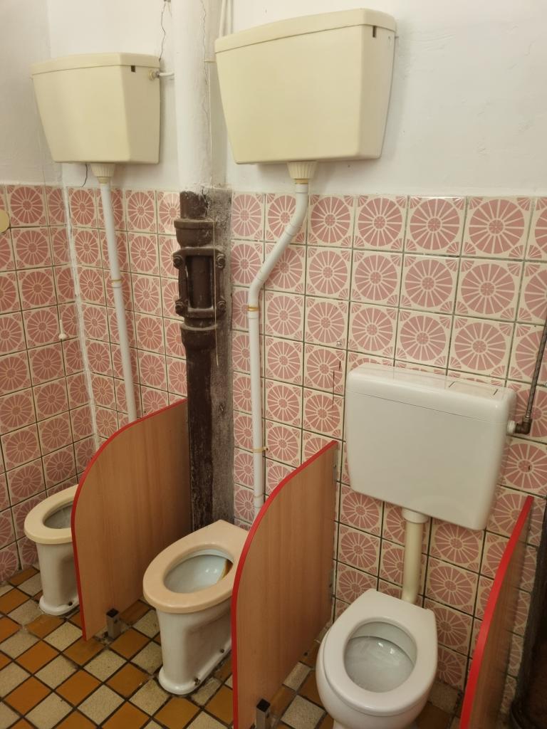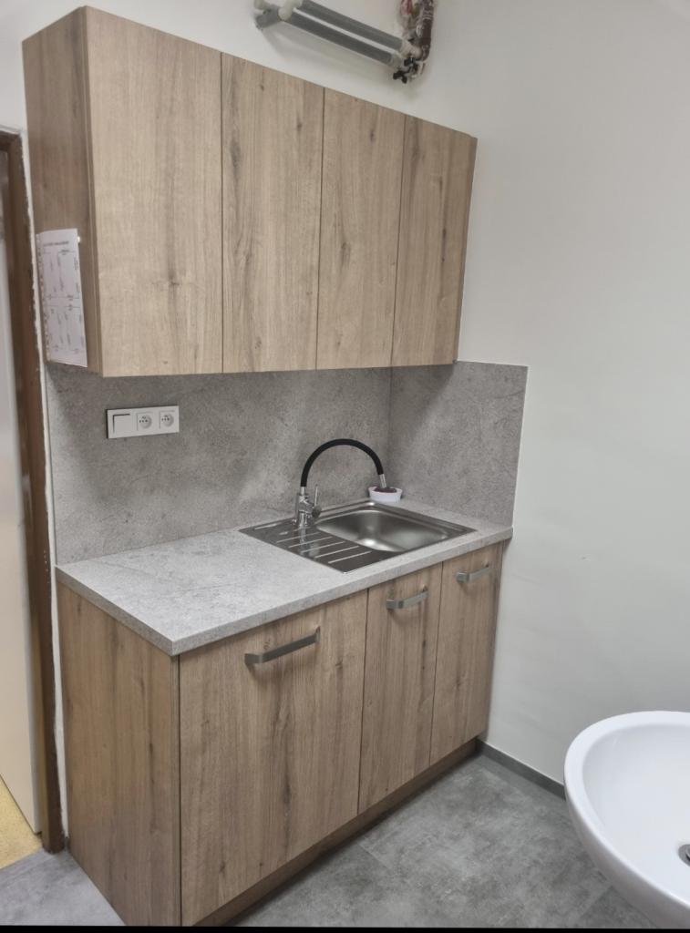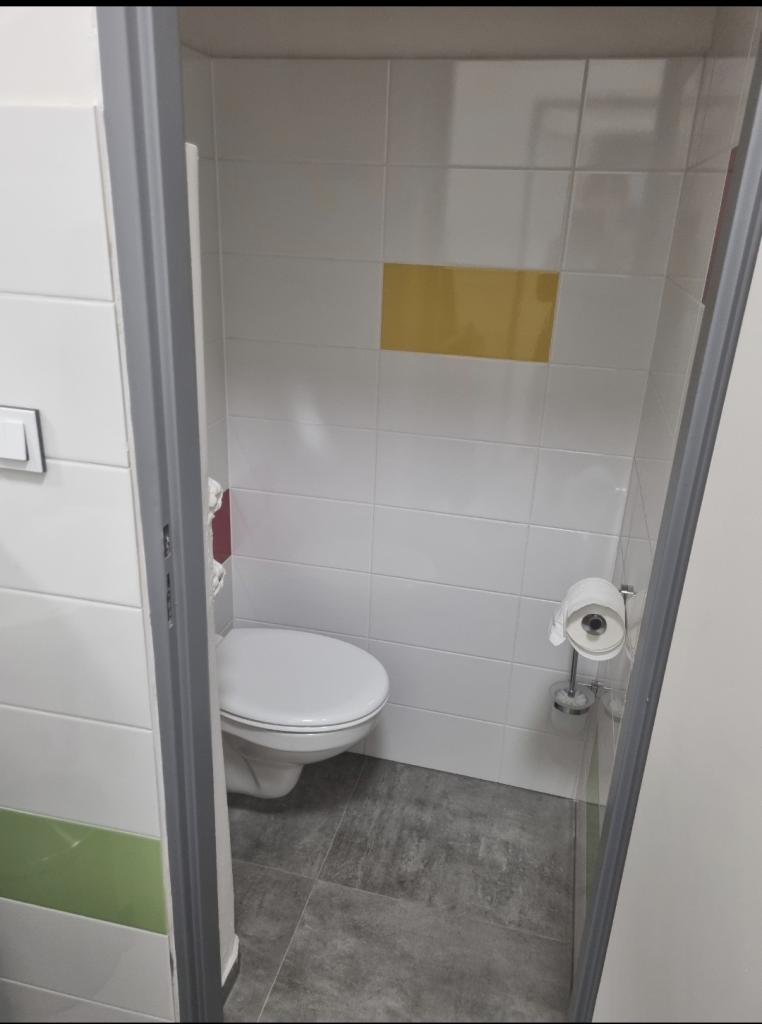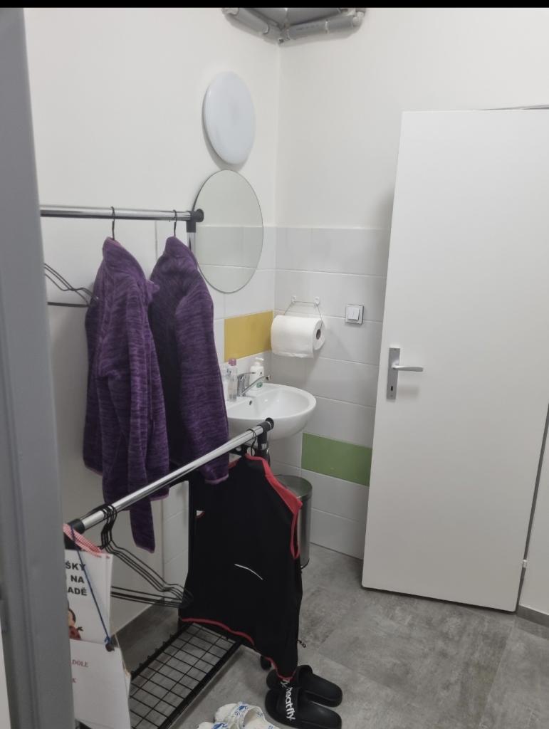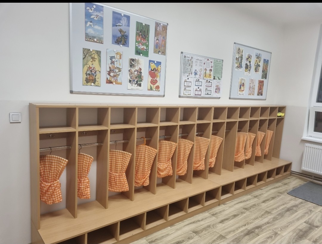 sociální zařízení, šatny dětí, zázemí učitelek, úklidová komora, sklad čistících prostředků a přípravná kuchyňka
