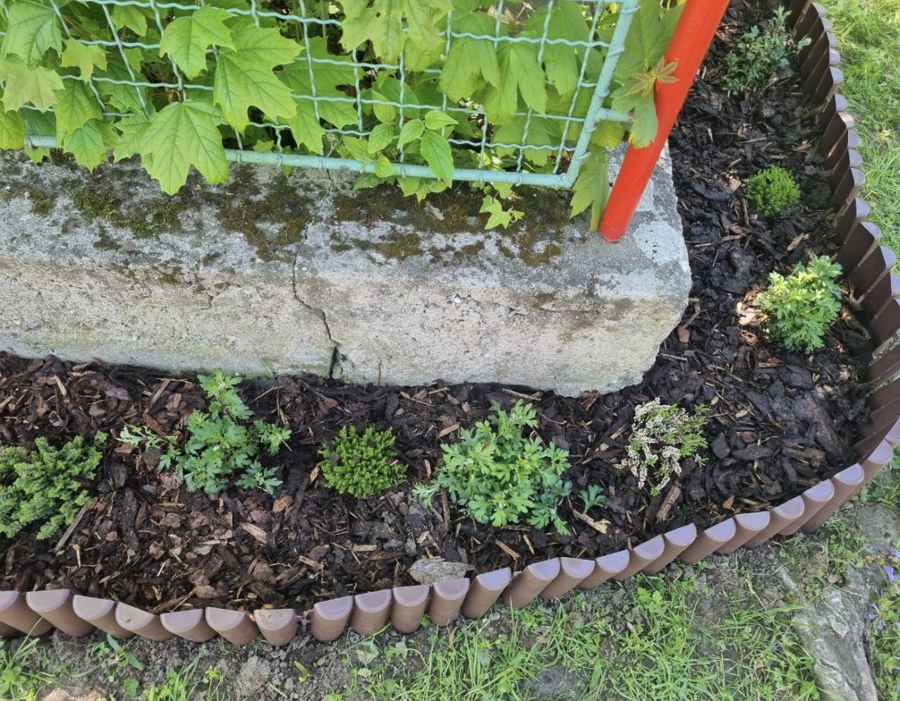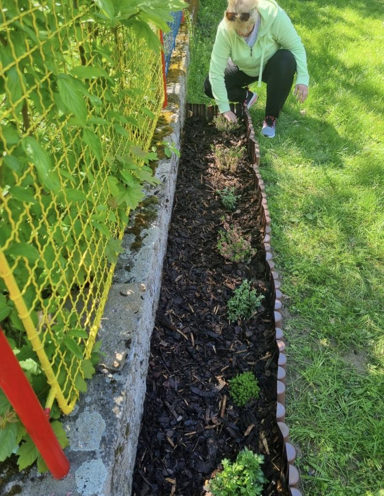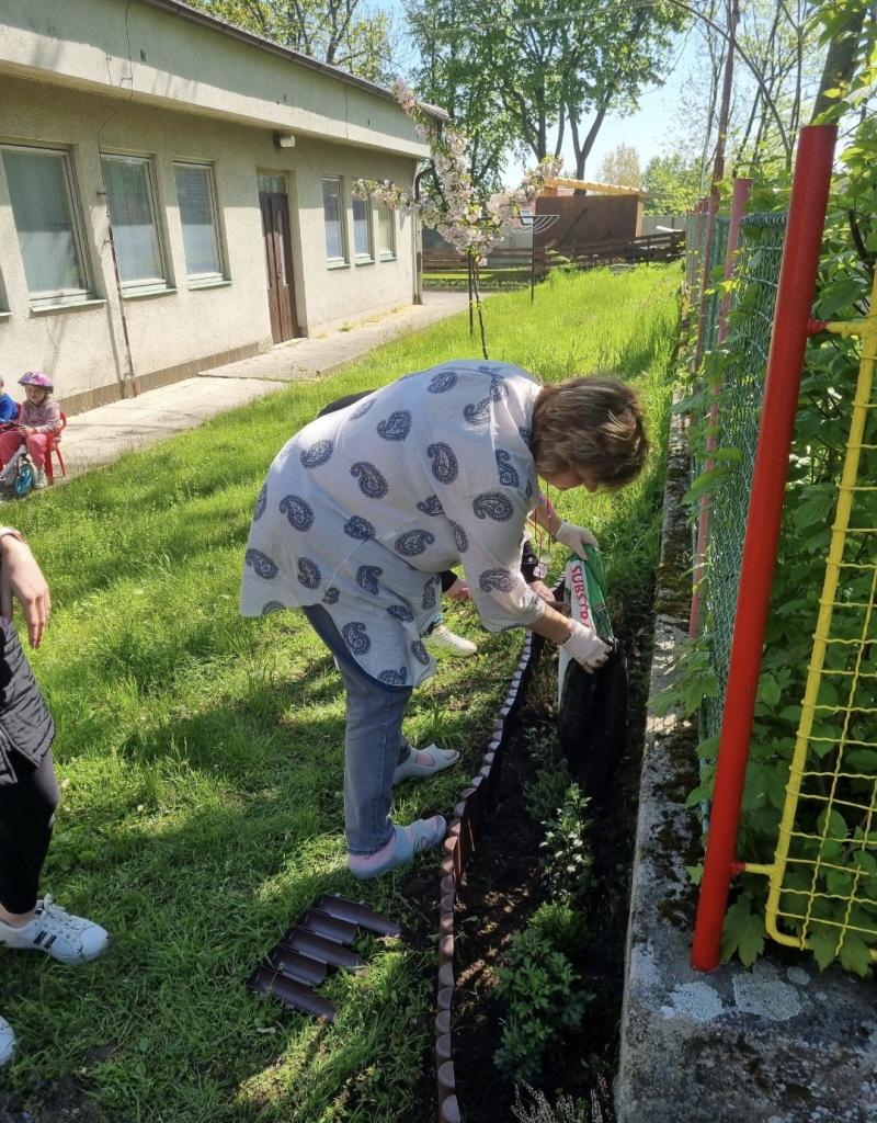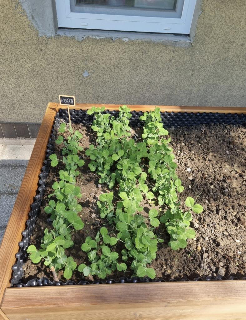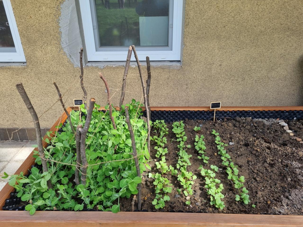 - květinový záhon na zahradě MŠ - vyvýšený záhon - už nám roste hrášek i ředkvičky