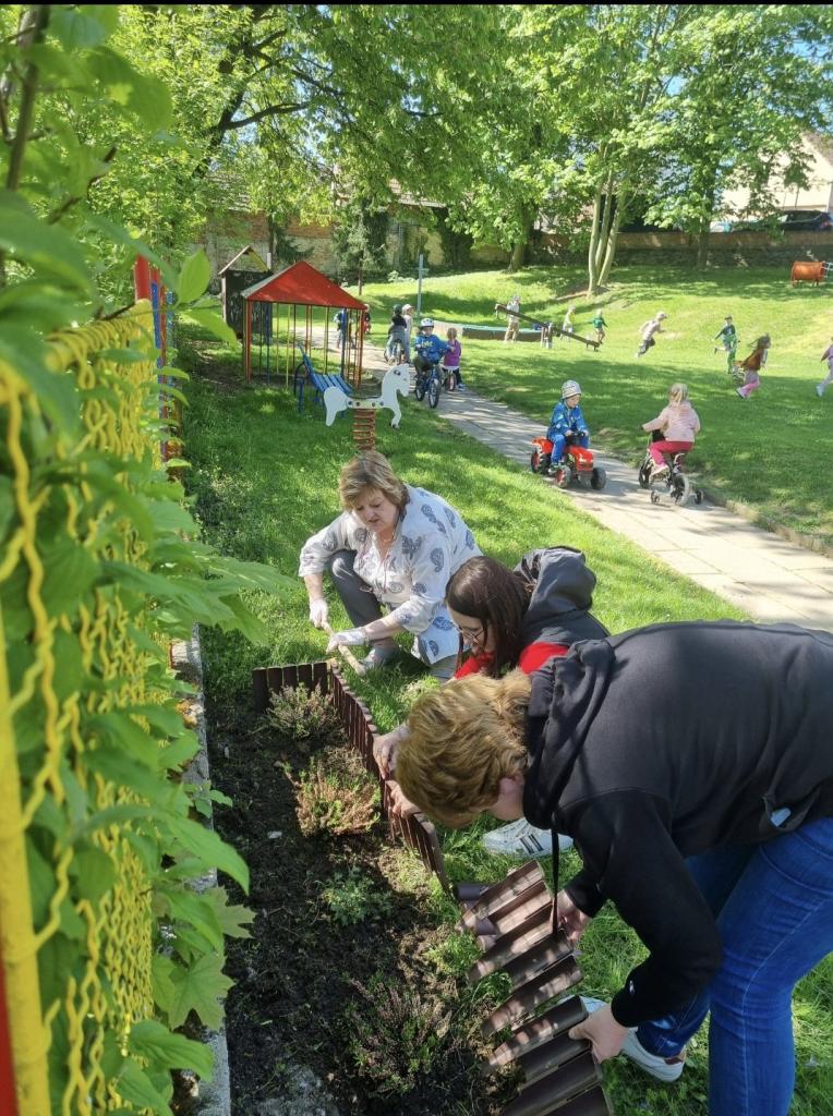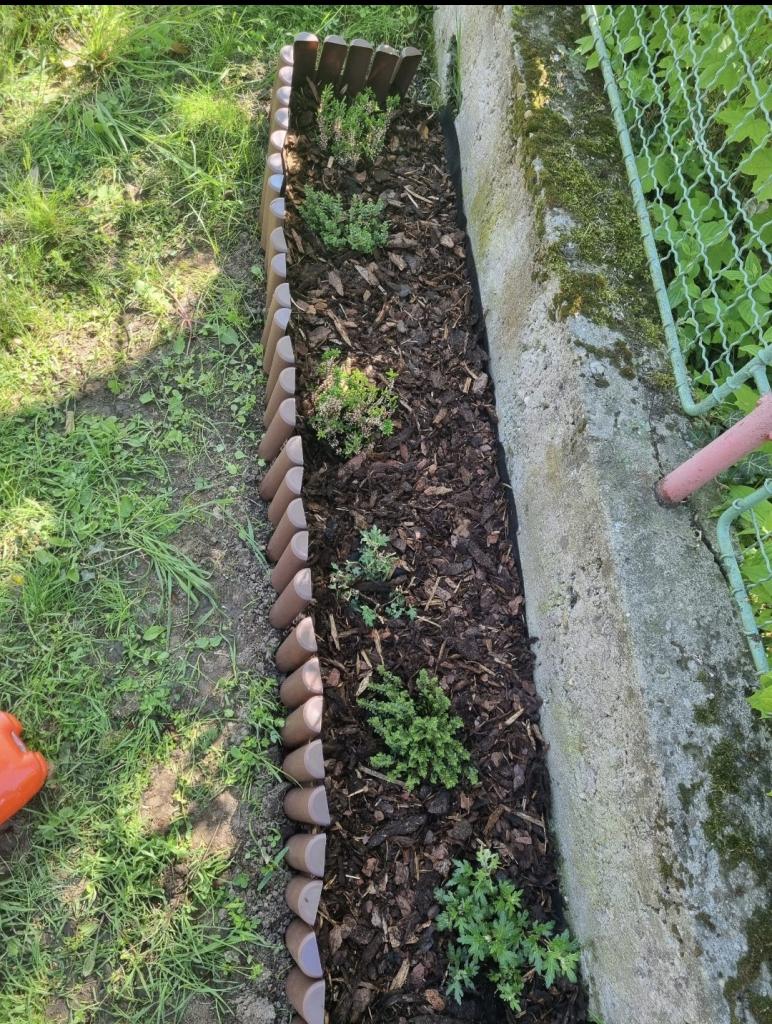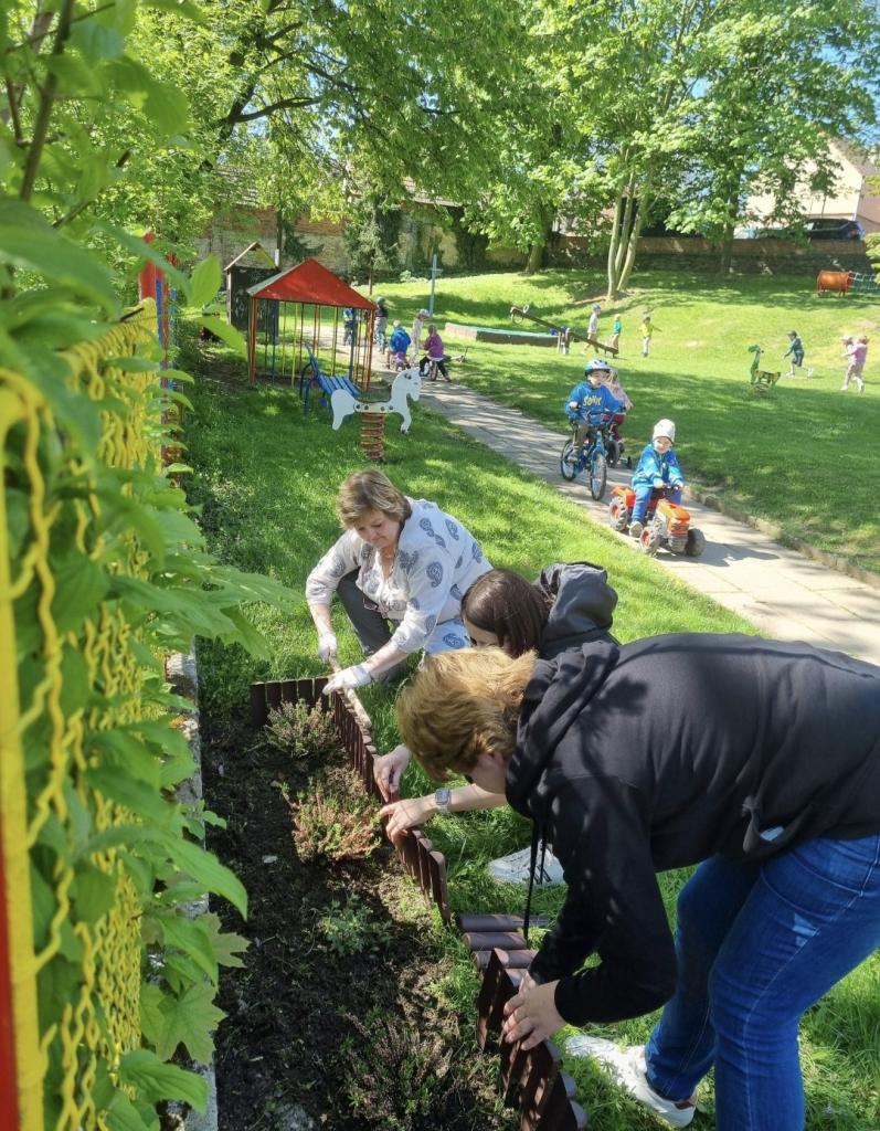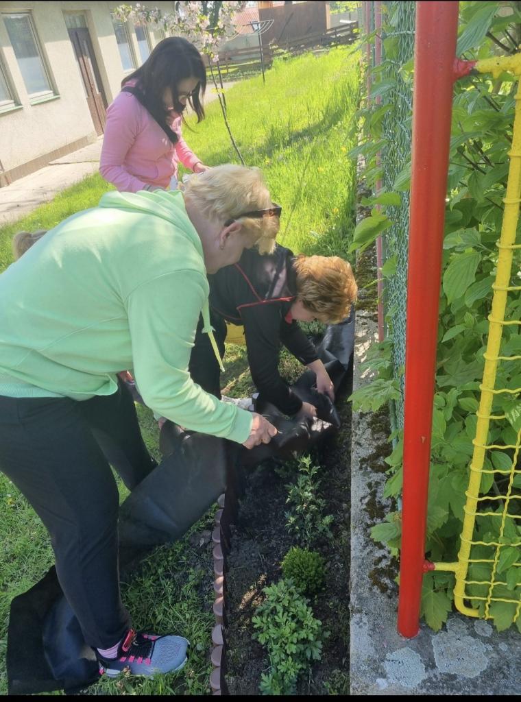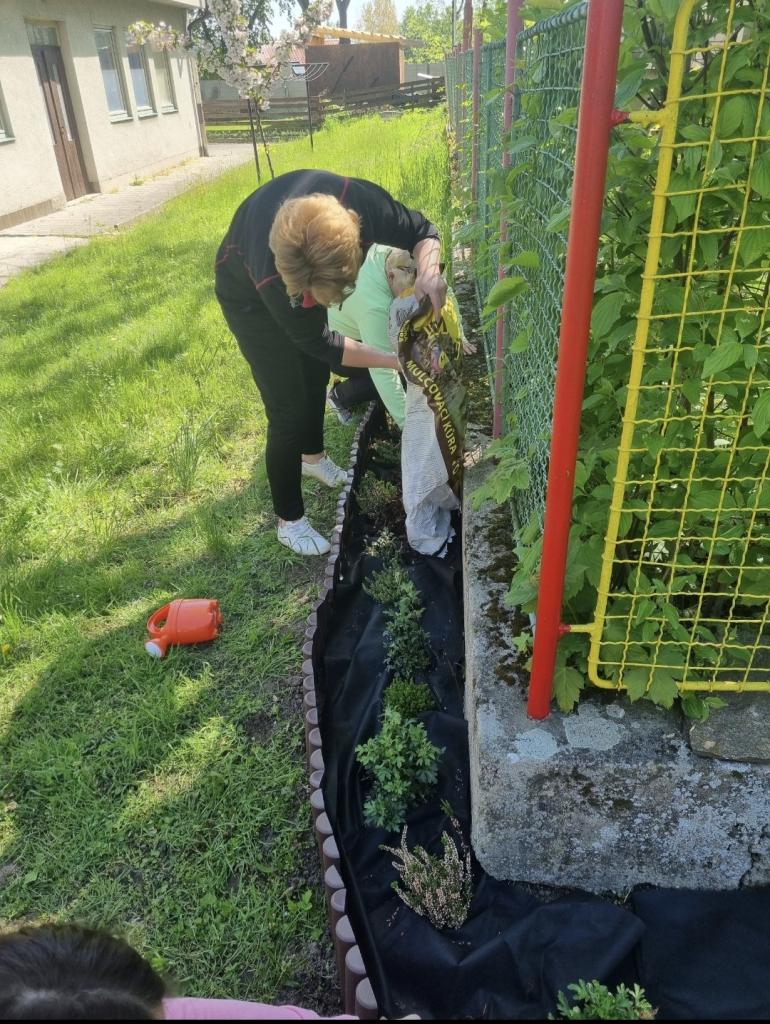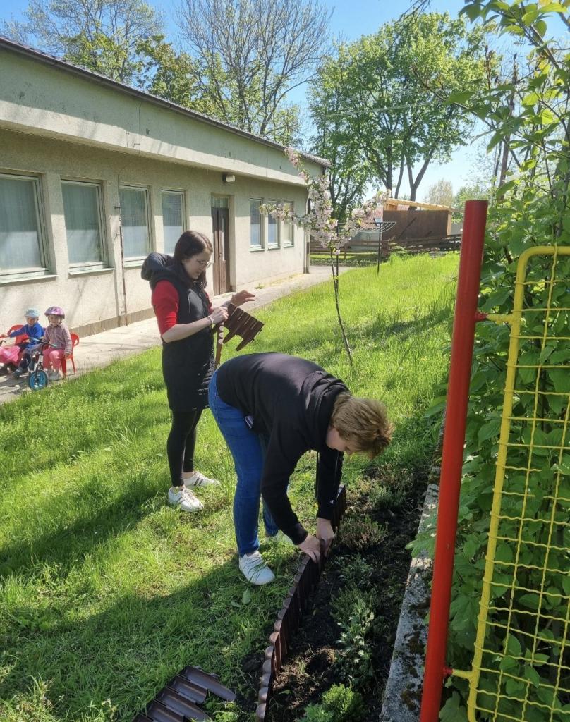 - květinový záhon na zahradě MŠ - vyvýšený záhon - už nám roste hrášek i ředkvičky
